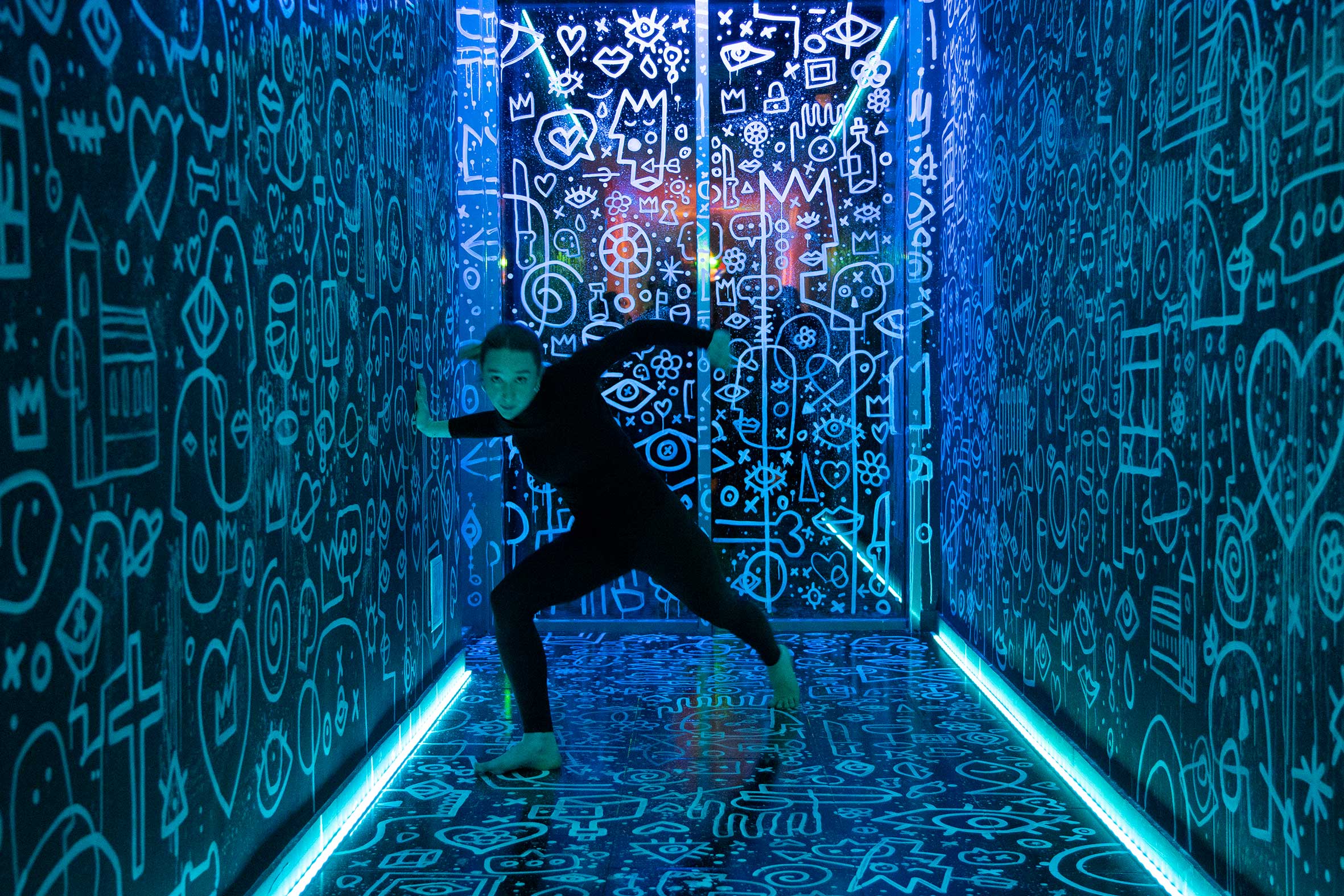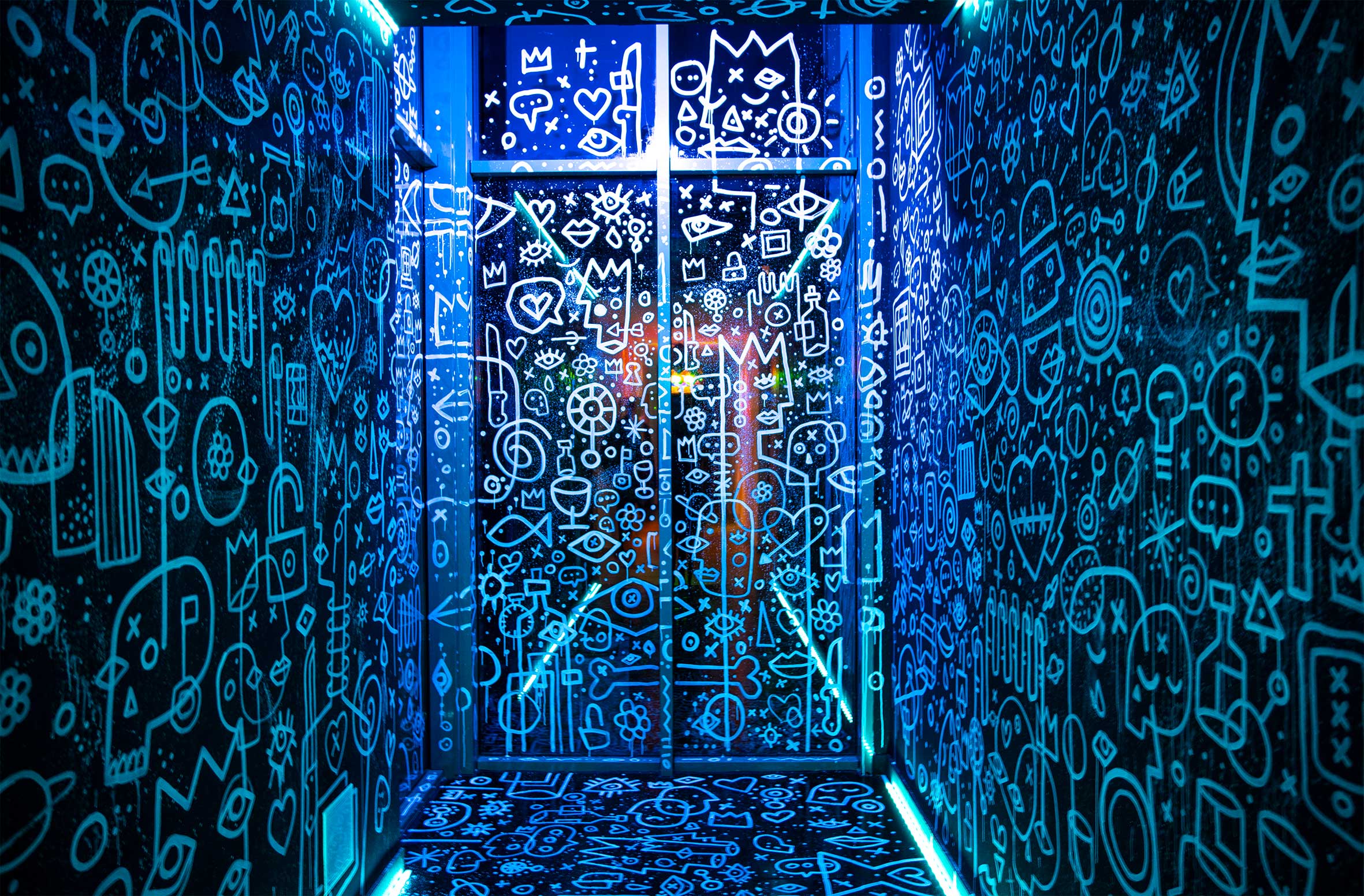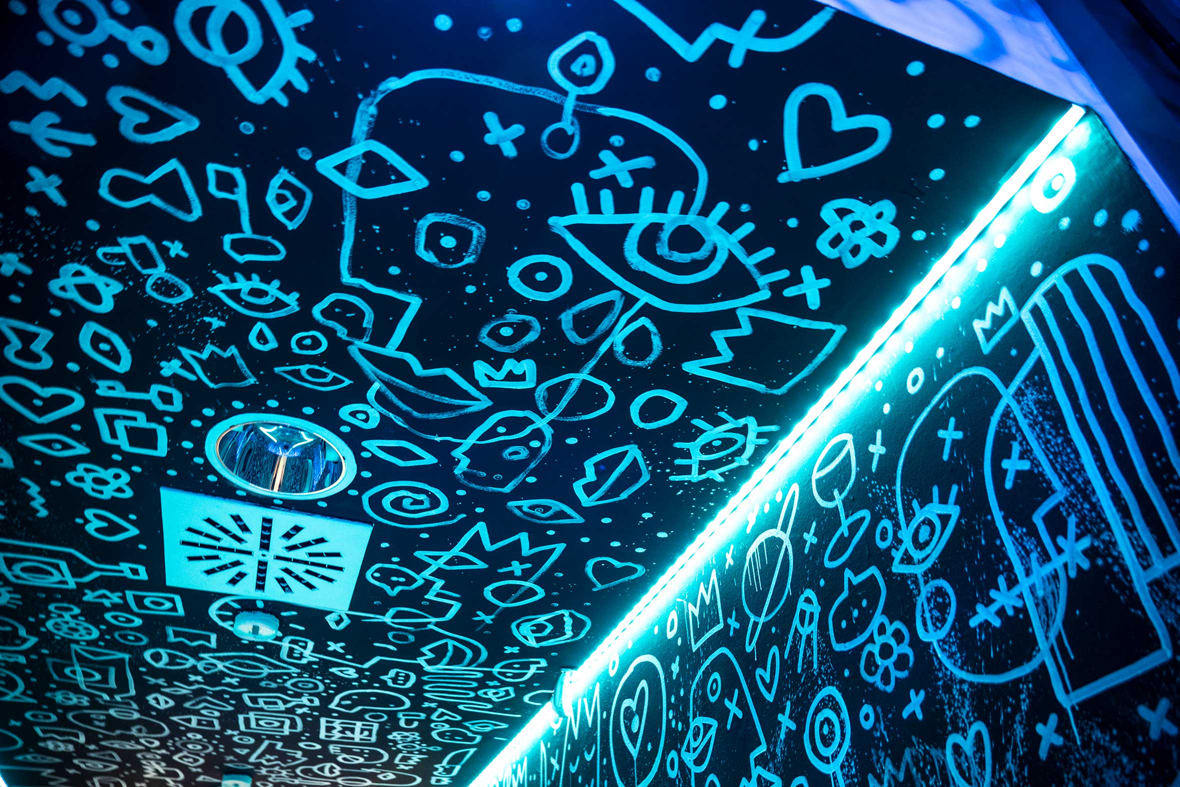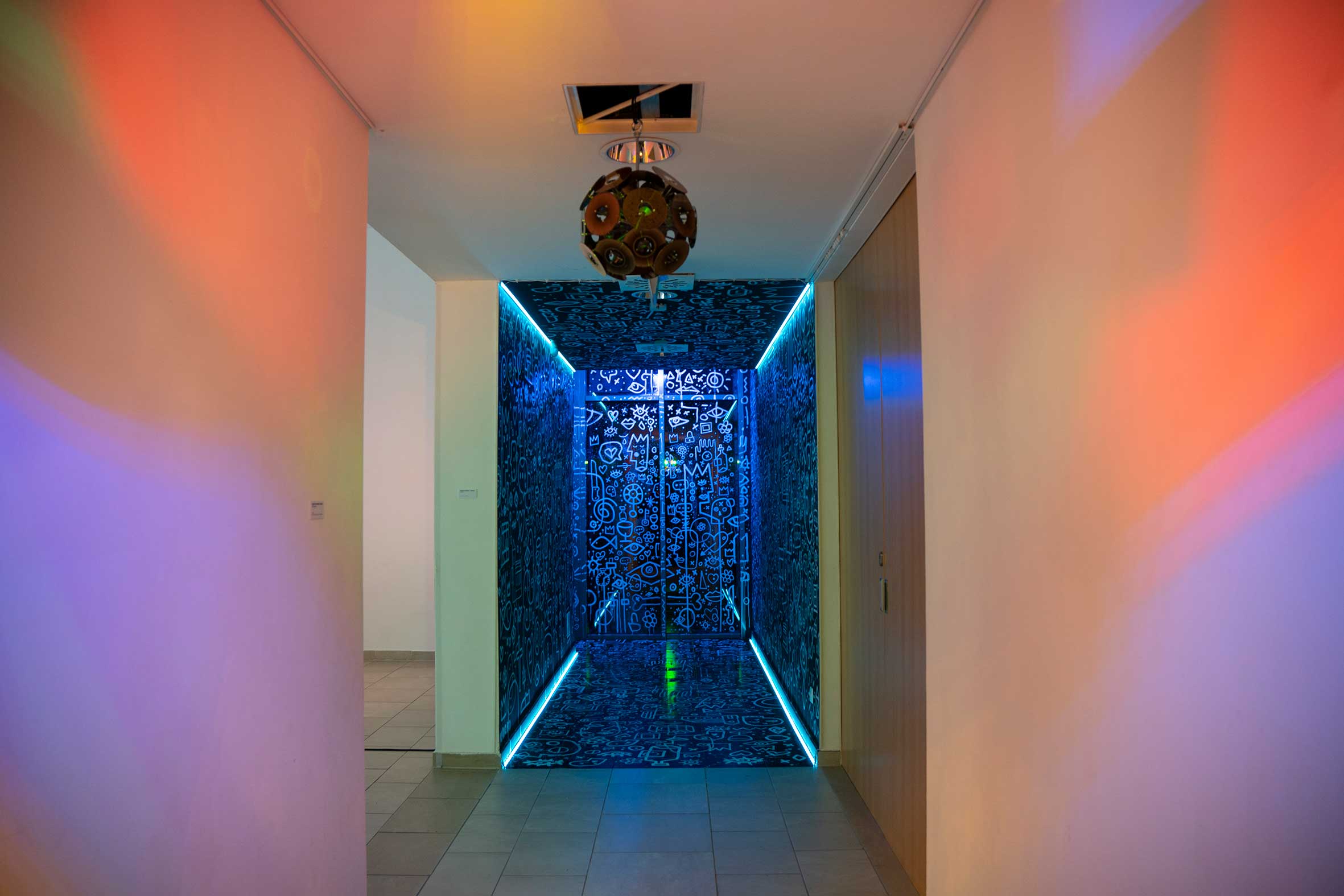 Krizbai Gergely – Krizbo – helyspecifikus installációjában minden látogató beléphet egy különleges fantáziavilágba, ahol a fény segítségével az alkotó gondolatai terítik be a teret.