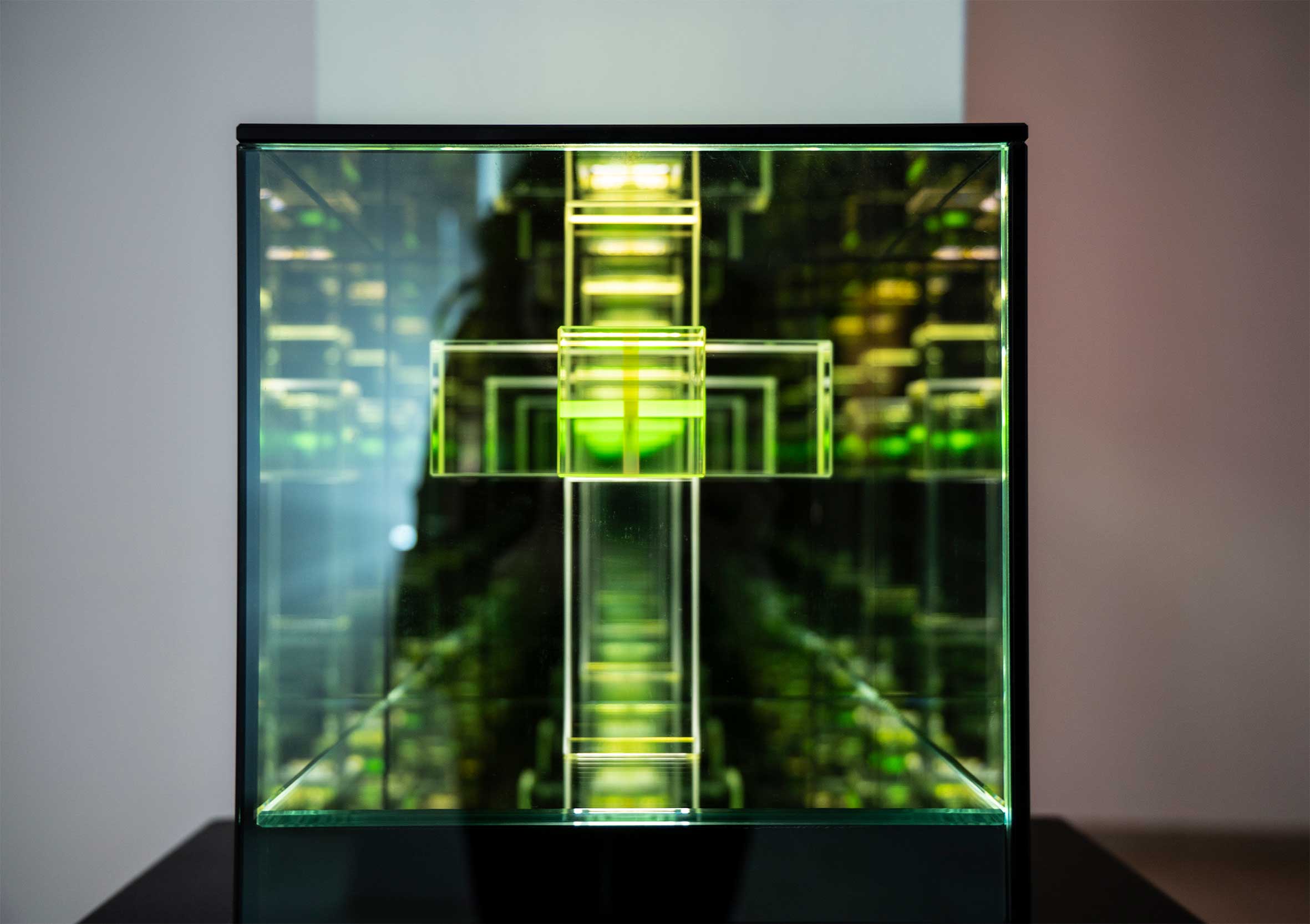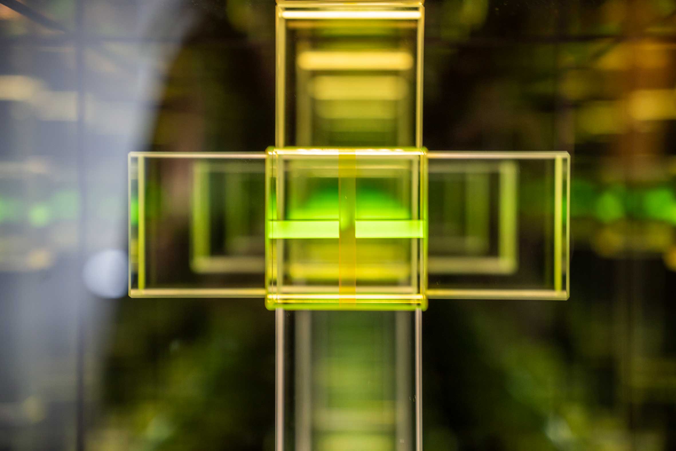 Az új koncepciónk szerinti kiállítás másik ágát a fény szobrok jelentik, melyhez jelen esetben Botos Péter üvegszobrász barátunkat kértük fel egy sorozat létrehozására, melynek első elkészül alkotása a Bizmut Cross. Péterrel különleges a kapcsolatunk, hiszen az első kiállításunk Balatonfüreden még 2021-ben vele volt közös, és már ott látszódott, hogy a munkáink külön-külön érdekes párbeszédre kezdenek egymással. Jelen esetben Botos Péter egyik ikonikus munkáját készítette el a kereszt formájában, kérésünkre egy fényre igencsak reagens urán üveggel megbolondítva. Ezek után mi megmunkálva az üvegeinket fénnyel láttuk el a szobrot, és a saját magunk által kitalált rendszerükbe helyeztük el. Az eredmény a Bizmut Cross című alkotás, az első fényszobor, mely a Bizmut ásvány sokszínűségéről kapta a nevét, hiszen a munkában egyrészt az optikai üvegnek, és urán üvegnek köszönhetően fehér fény hatására is több szín keletkezik, azonban ezt mi még a színek változtatásával tovább tudjuk bolondítani.