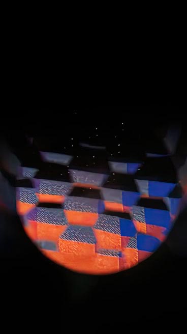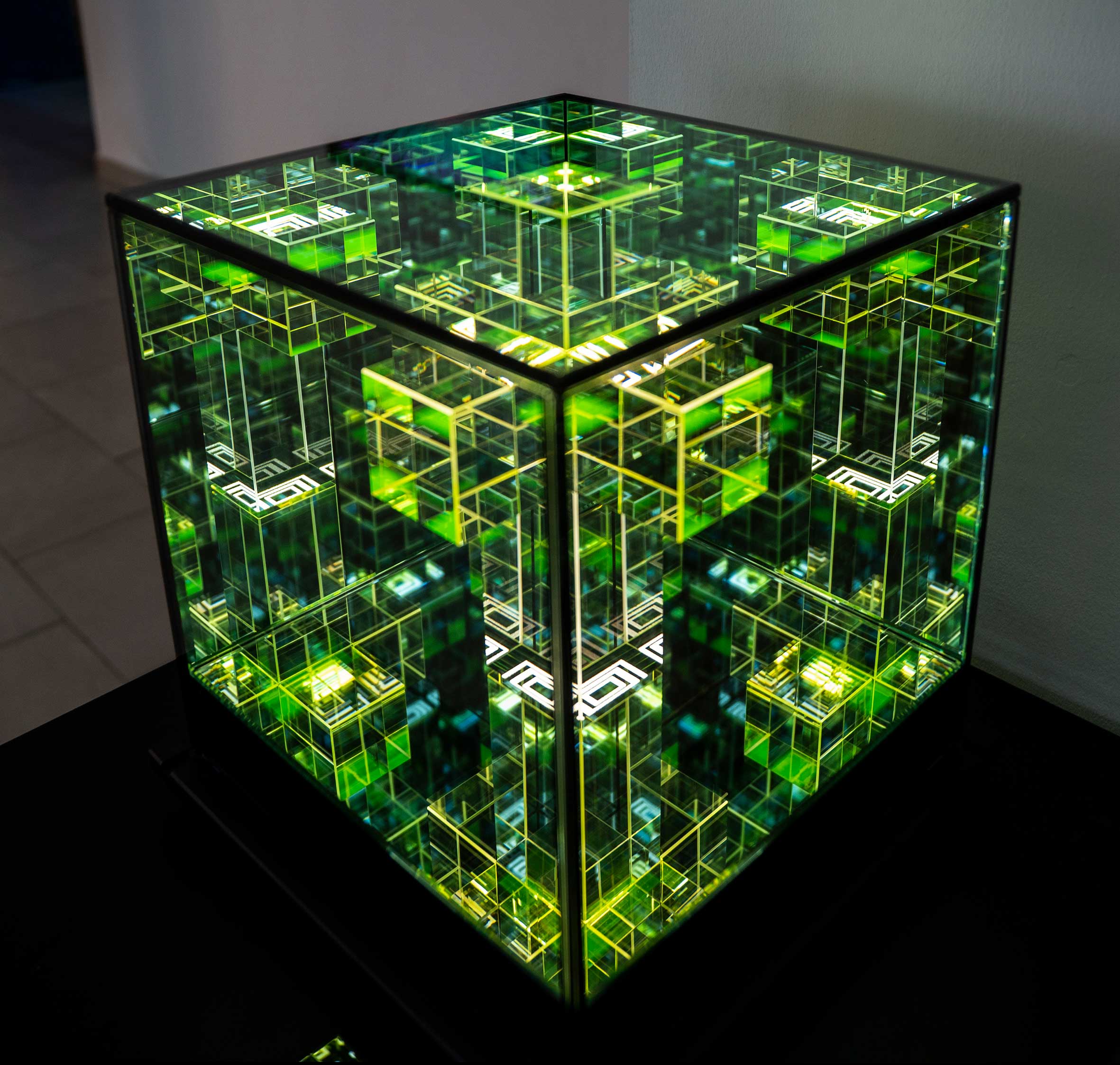 Ebben a munkánkban használtunk először nem teljes sík felületű üveget, aminek következtében a mű központi részében egy izgalmas látvány keletkezik. Az üveg és tükör felületek fizikája miatt ezen a részen a domborodó felület egy torzítást képez le a körülötte lévő viszonylag egységes fény-struktúra alapján. Ez a torzítás, ahogy mozgunk a mű előtt egy mozgó hatást vált ki, olyan, mintha a mű belseje változna a betekintési pozíciótól függően. Alapvetően a célunk olyan szemmel láthatatlan erők bemutatása volt ezen munkában, amik a természetben képesek akár torzítani a teret, és az időt is, az extrém erős energia miatt. Az időt, vagy az idő változását a folyton változó színekkel próbáljuk meg szemléltetni, mivel a variációk tárháza elég sok, így a betekintő számára megfogalmazódhat az a kérdés, hogy vajon a pillanatnyi látványt fogja-e újra látni, és mikor. A mű közepe, akár egy fekete lyuk, ahol extrém magas gravitáció van jelen, láthatóan beleszól a körülötte lévő egységes rendszer működésébe.