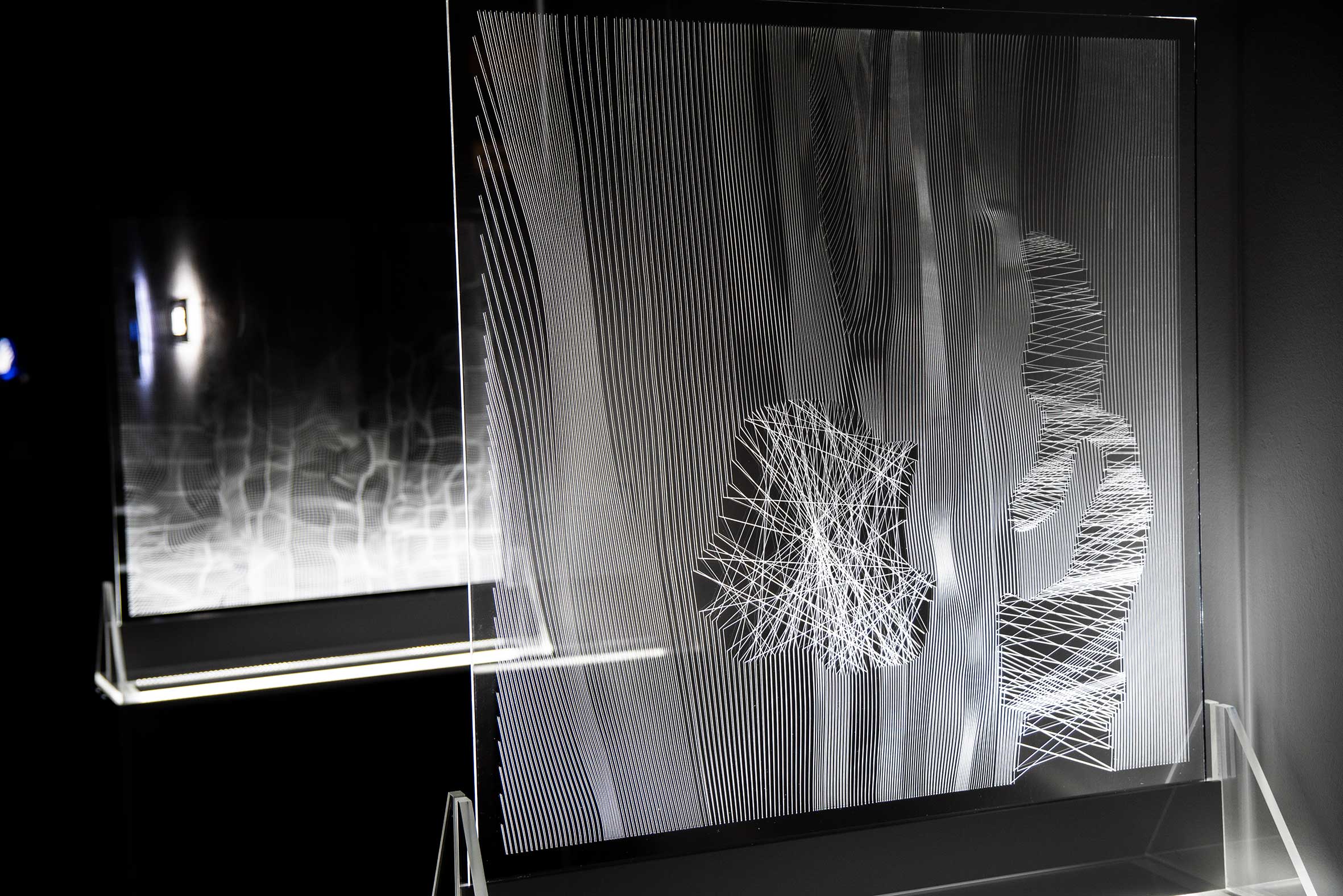 Plexi lemez két oldalára 1-1 vonalrajzot gravírozok. A lemez alsó éléből LED világítás hívja elő a fénylő vonalak együtteséből kialakuló látványt. Sajátos tulajdonságai közül kiemelem a tiszta vonalrendszer jelleget, a fehér fényű rajzolatuk könnyedségét, a szemlélő aktív hozzájárulását a végső élményhez. A síkon létrehozott vonalrendszerek térbelivé válnak, a szemlélődés közben keletkező finom mozgások az időbeliség érzetét keltik. Fontos szerepet kap a “kis változások” ábrázolása.